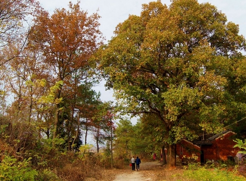 古老而古朴的银杏树,有声有息,隐于群山环抱,现于农庄炊烟之间,没有太多人的打扰,没有太多的俗气,更没有丝毫的商业气息。沿着江东村由火山石铺成的小道,慢慢走进古银杏村时,一地金黄,小路上、墙头上、瓦房上、水沟边、菜地里,漫步村中小巷,不经意间,银杏叶洒满一身,与夕阳的余辉融为一体……