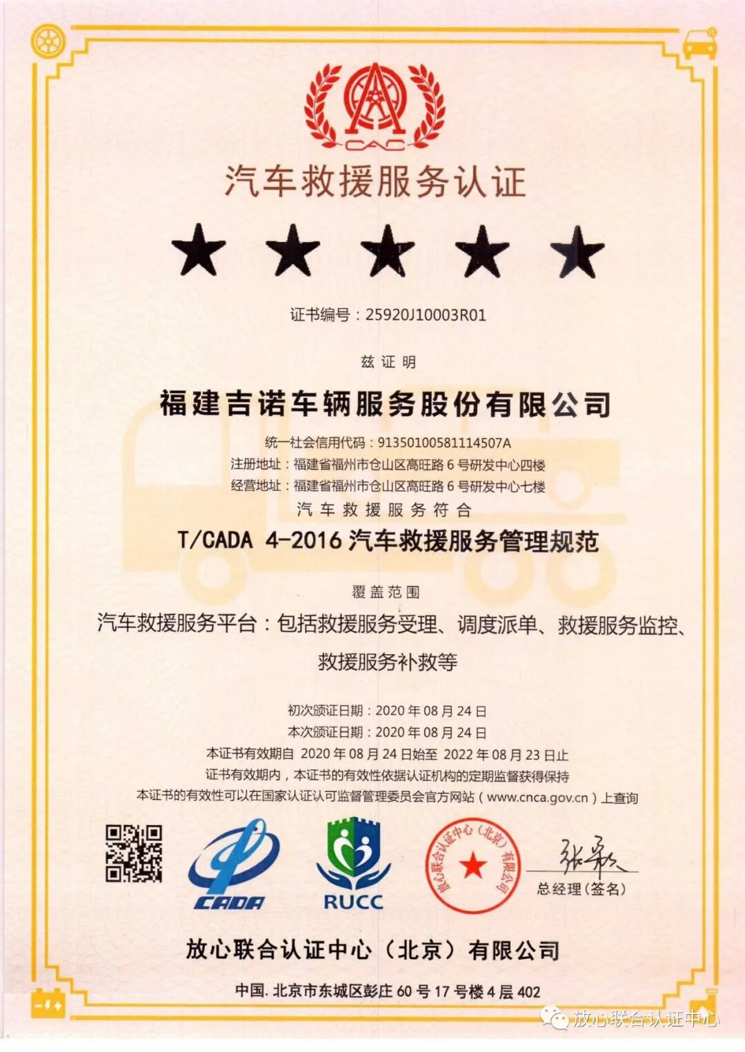 福建吉诺车辆服务股份有限公司提出认证申请,通过严格审核后,确认于2020年08月24日通过认证。汽车救援服务认证是依据中国汽车流通协会在2016年7月15日发布的团体标准T/CADA 4-2016 《汽车救援服务管理规范》对汽车救援企业进行国家级认证。