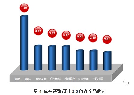 2012年9月26日,中国汽车流通协会对外发布2012年8月份“汽车经销商库存调查结果”。调查显示,汽车经销商库存连续2月下降,8月份综合库存系数微降至1.65,但仍高于1.5的警戒水平;与7月份相比,自主、合资和进口品牌库存系数均呈现微幅下降;高库存(库存系数大于2.5)品牌7个,比上月的10个有所减少;8月份库存系数最高的品牌是讴歌,库存系数为7.90。