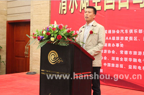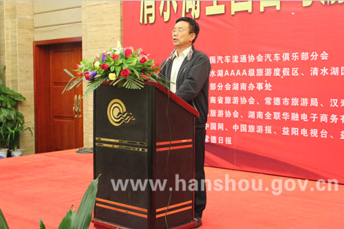 常德市旅游局副局长施才明致欢迎辞 清水湖旅游度假区作为湖南首家挂牌的全国自驾游活动基地,将会成为全省首家自驾游活动集散中心,充分利用汽车俱乐部分会资源优势以及窗口行业的影响和辐射作用,在自驾游的规范化管理、基础设施建设、文明服务以及宣传推介等方面做出表率,在应对和解决全国汽车自驾游活动基地自驾游出现的各类问题方面发挥示范作用,从而满足游客自驾游的需求,整体推动自驾游活动健康开展,提升常德乃至湖南旅游的对外影响力。