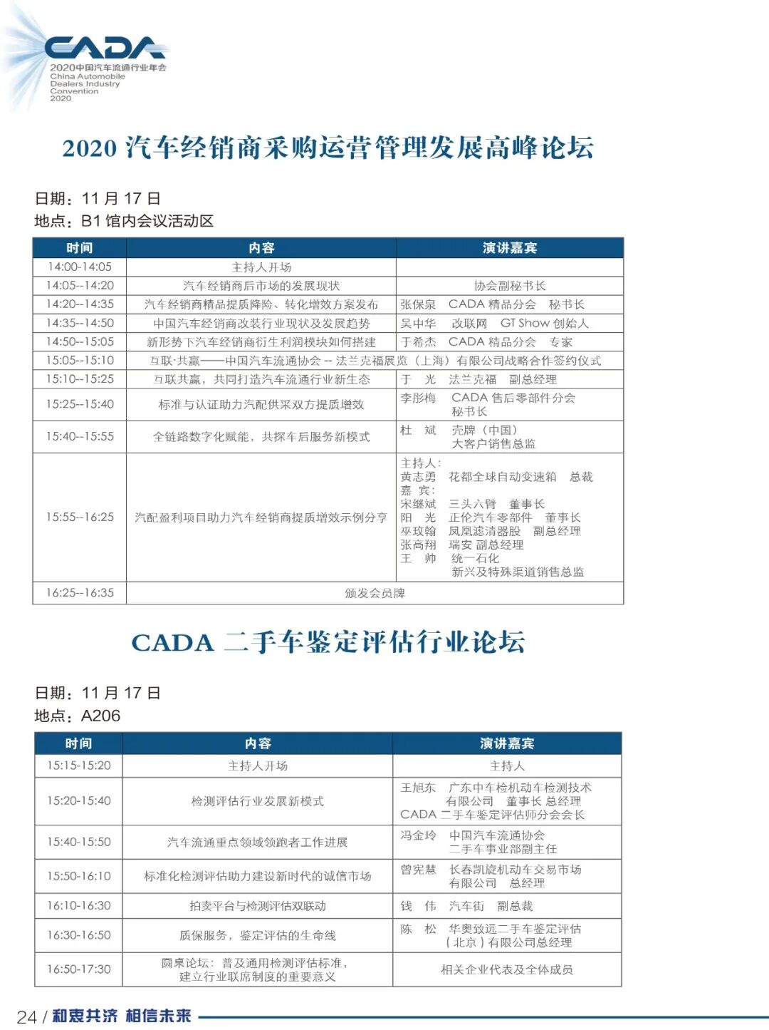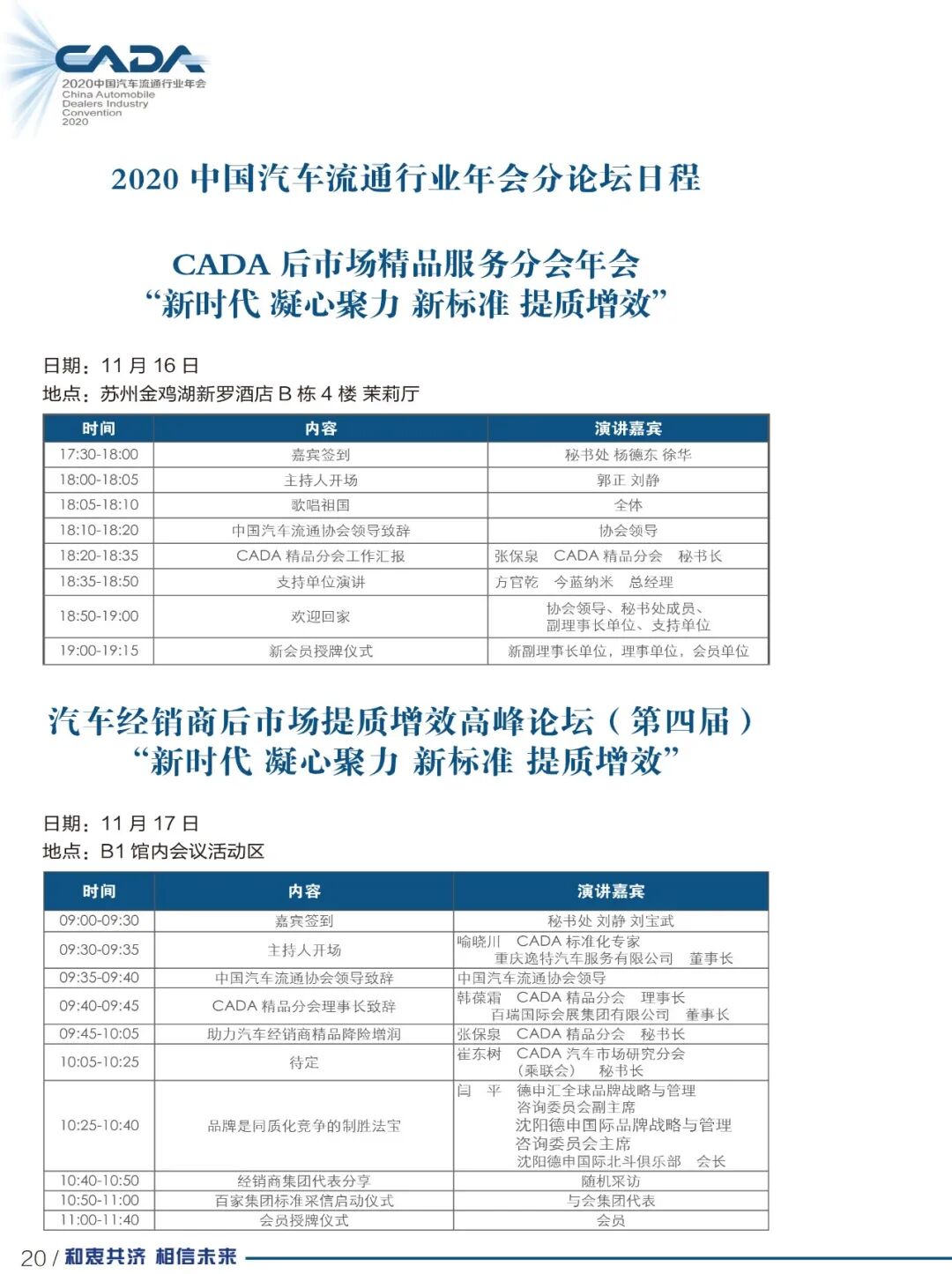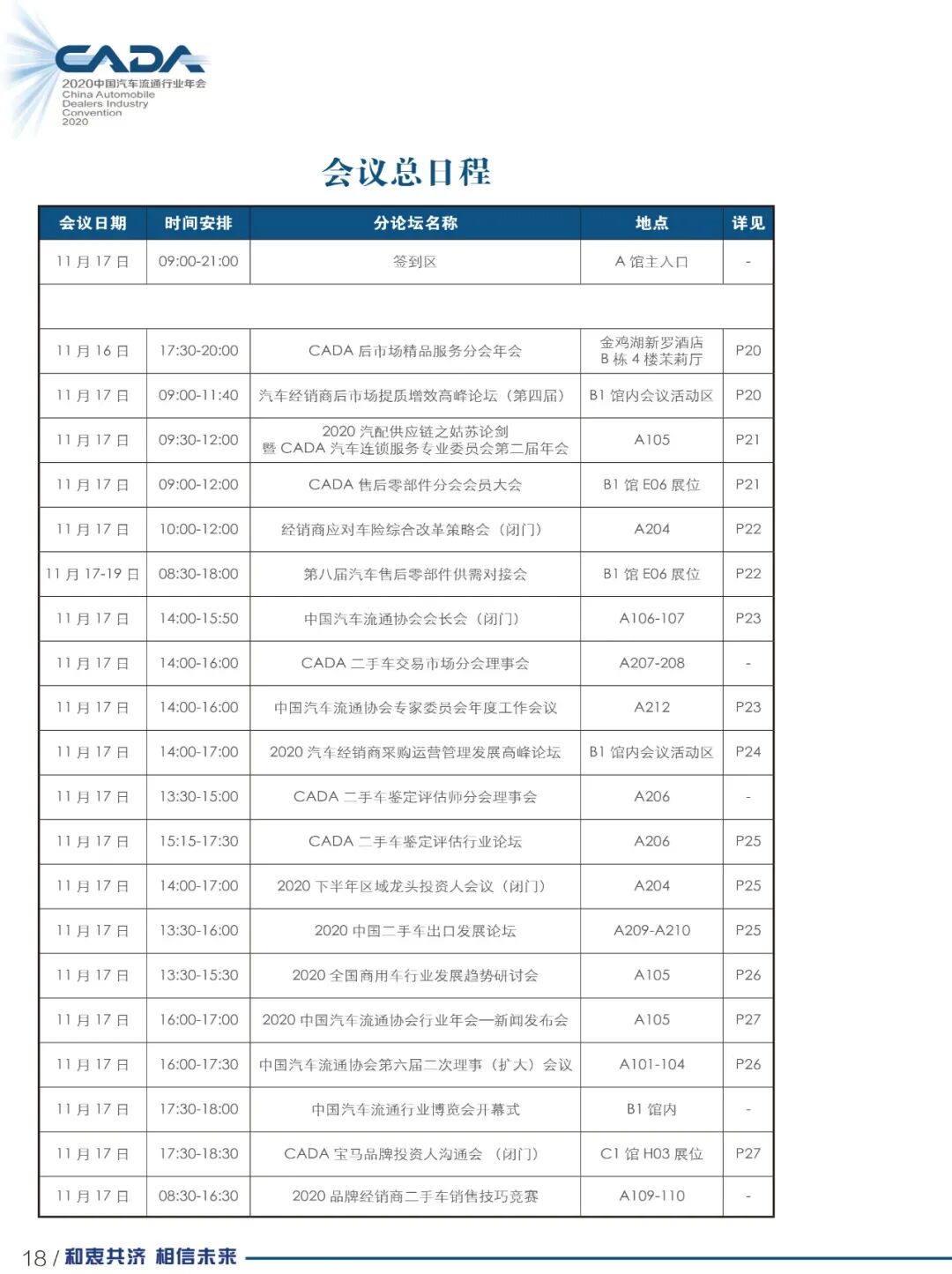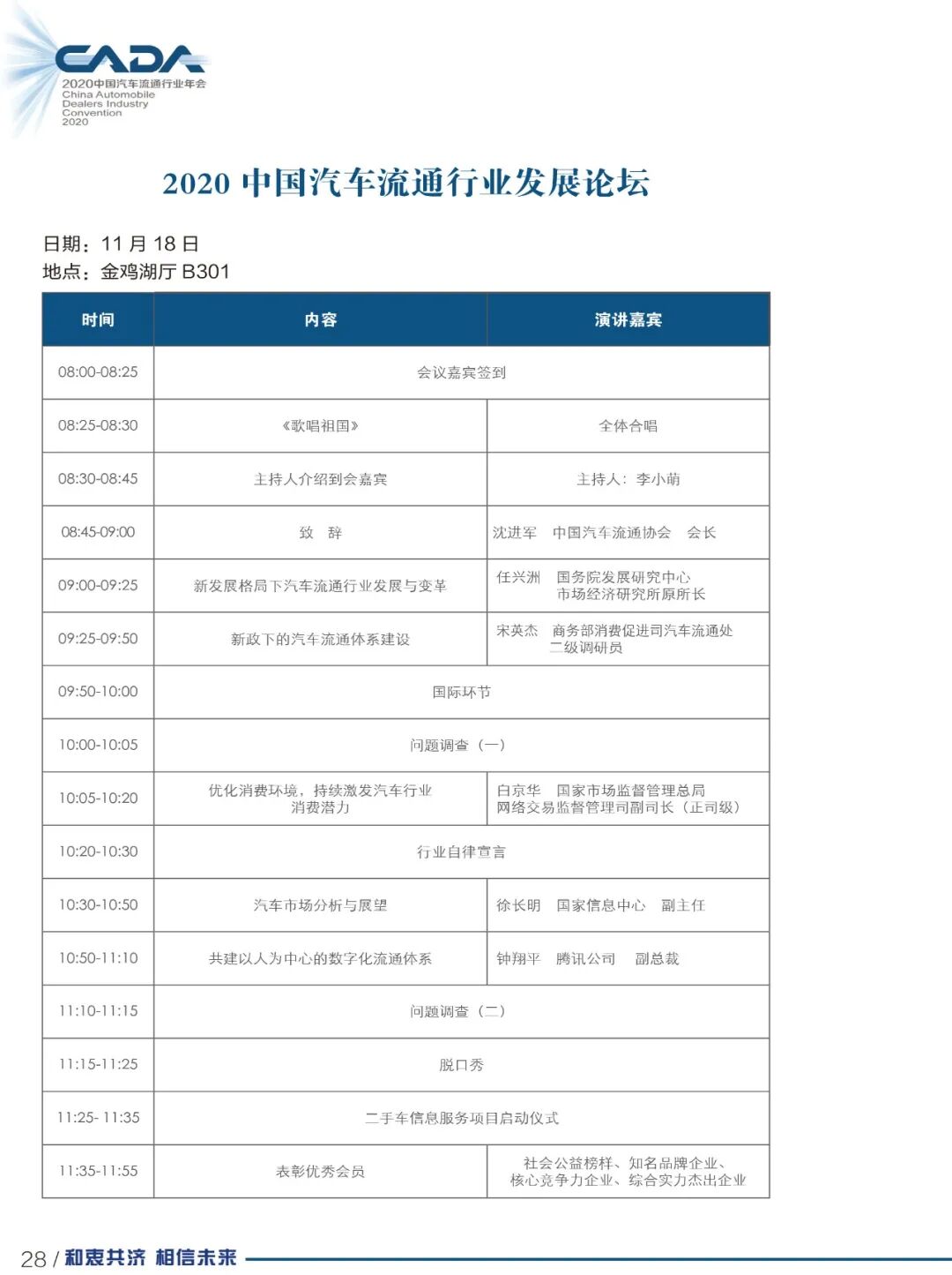 由中国汽车流通协会主办的“2020中国汽车流通行业年会暨博览会”将以“和衷共济 相信未来”2020年11月17-19日在苏州国际博览中心举办。迄今为止,所有会议议程全部确认,正式发布如下: