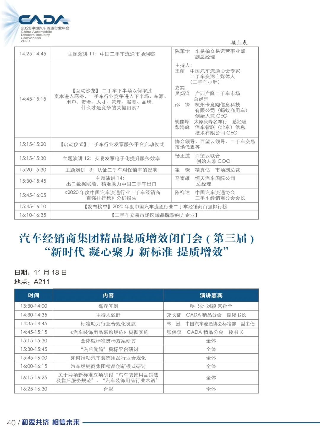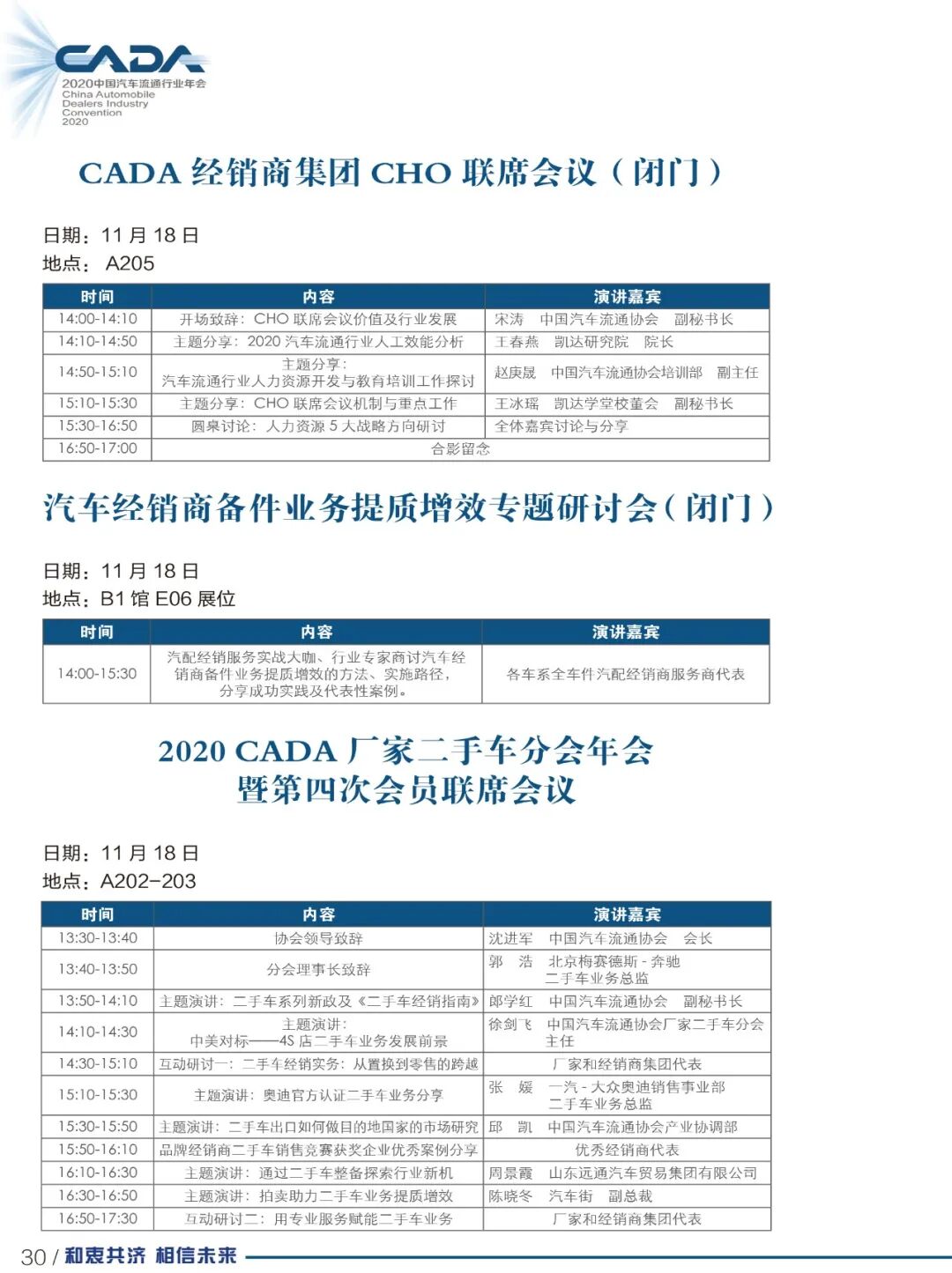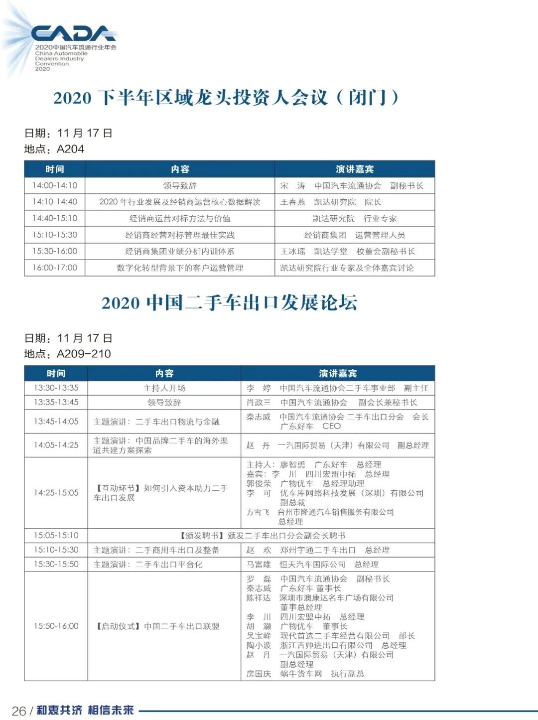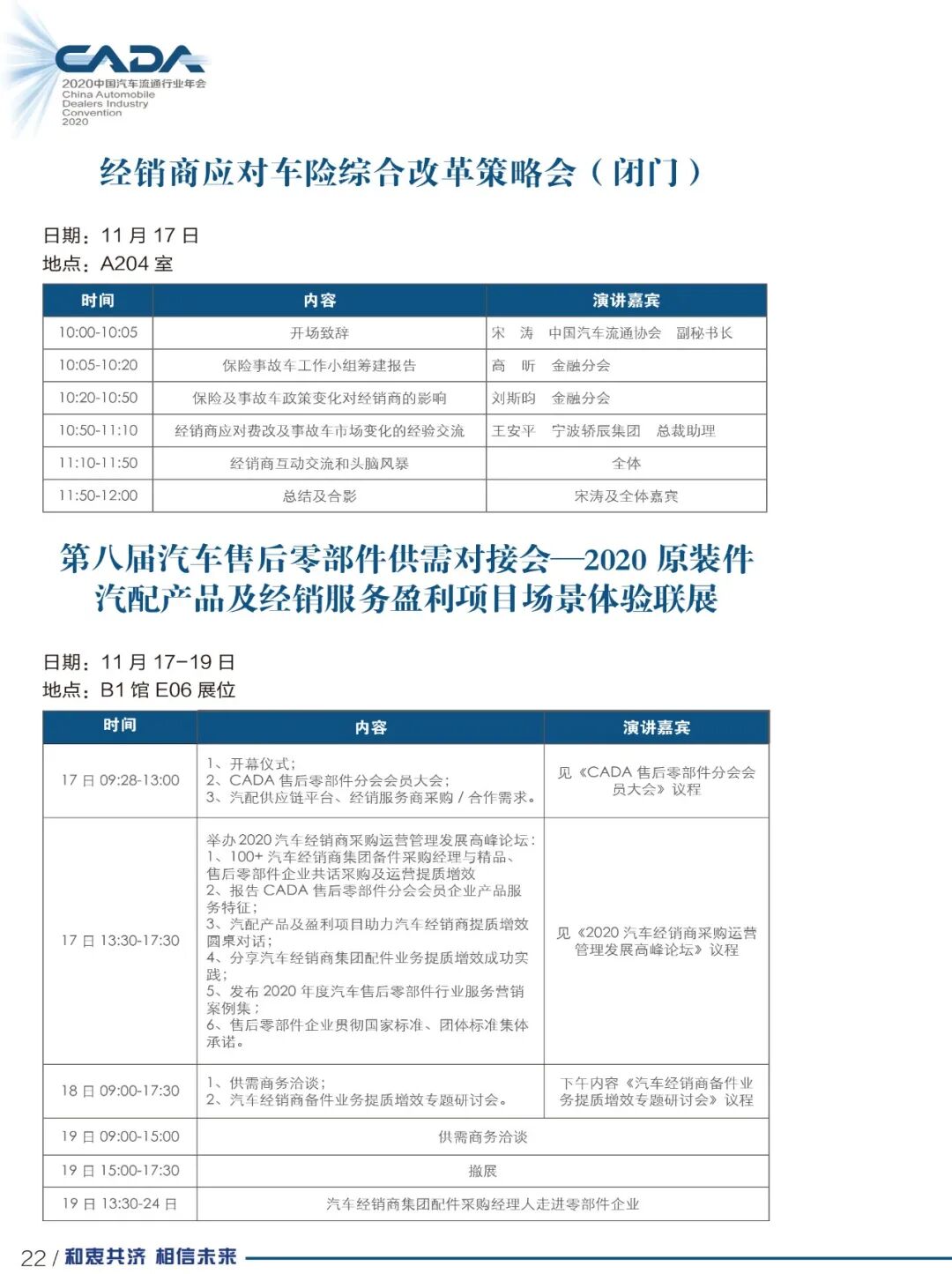 由中国汽车流通协会主办的“2020中国汽车流通行业年会暨博览会”将以“和衷共济 相信未来”2020年11月17-19日在苏州国际博览中心举办。迄今为止,所有会议议程全部确认,正式发布如下: