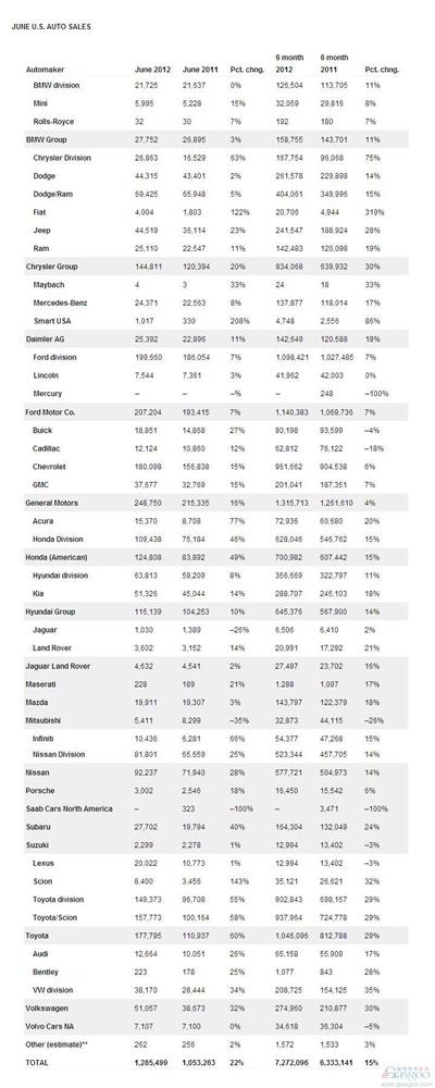 Autodata公司提供的美国车市6月及上半年销量数据 通用汽车:6月全面增长 通用汽车今年6月在美销量为248,750辆,同比增长15.5%;上半年在美销量达1,315,713辆,同比增长4.3%。 雪佛兰品牌6月在美销量同比增长14.8%至180,098辆;上半年在美销量共计961,662辆,同比增长6.3%。 GMC品牌6月在美销量同比增长14.9%至37,677辆;上半年在美累计销量同比增长7.3%至201,041辆。 别克品牌6月在美销量为18,851辆,同比增长26.8%;上半年累计销量为90,198辆,同比下降3.6%。 凯迪拉克品牌6月在美销量12,124辆,同比增长11.6%;上半年累计销量62,812辆,同比下降17.5%。 福特:6月保持今年平均步调 福特汽车今年6月在美国市场销量为207,204辆,而去年6月为193,415辆,同比增长7.1%;上半年销量为1,140,383辆,在去年同期1,069,736辆的基础上同比提高6.6%。 福特业务部的福特品牌6月销量从186,054辆同比增长7.3%至199,660辆;上半年从1,027,485辆同比提升6.9%至1,098,421辆。林肯品牌6月销量从7,361辆同比增长2.5%至7,544辆;上半年从42,003辆同比略下降0.1%至41,962辆。水星品牌去年上半年累计销量248辆,今年该品牌无销量。 克莱斯勒:增长领衔三巨头 2012年6月,克莱斯勒集团在美国市场销量144,811辆,比去年6月的120,394辆增长20.3%;上半年在美累计销量834,068辆,较去年同期的639,932辆提高30.3%。集团旗下克莱斯勒、道奇、Jeep和Ram(公羊)品牌均实现增长。 各品牌销量情况: 当月销量增幅最高的为克莱斯勒品牌,6月销量26,863辆,比去年同期的16,529辆增长63%;上半年累计销量167,754辆,较去年同期的96,068辆提高75%。 当月销量最高的为Jeep品牌,6月销量44,519辆,比去年同期的36,114辆增长23%;上半年累计销量241,547辆,较去年同期的188,924辆提高28%。 道奇品牌6月销量44,315辆,比去年同期的43,401辆增长2%;上半年累计销量261,578辆,较去年同期的229,898辆提高14%。 Ram品牌6月销量25,110辆,比去年同期的22,547辆增长11%;上半年累计销量142,483辆,较去年同期的120,098辆提高19%。 此外,菲亚特500车型6月销量4,004辆,上半年累计销量20,706辆。 丰田汽车:6成涨幅称雄,蝉联单一品牌销量冠军 丰田汽车成为6月份美国市场上同比增幅最高的主流车企,并且旗下丰田品牌也连续4个月成为在美销量最高的单一品牌。 6月份,丰田汽车在美销量为177,795辆,较去年的110,937辆同比骤增60.3%,由于销售日从26天增加到27天,因而按照每日销售速率DSR(Daily Sales Rate)计算,同比增长54.3%;上半年销量为1,046,096辆,而去年同期为812,788辆,同比提升28.7%,按照DSR同比提升27.0%。 丰田品牌在美6月销量为149,373辆,较去年的96,708辆同比增长55.5%;上半年销量为902,843辆,较去年同期的698,157辆同比增长29.3%。 雷克萨斯品牌在美6月销量为20,022辆,较去年的10,773辆同比增长85.9%;上半年销量为108,132辆,而去年同期为88,010辆,同比提升22.9%。 Scion品牌在美6月销量为8,400辆,较去年的3,456辆同比增长143.1%;上半年销量为35,121辆,较去年同期的26,621辆同比增长31.9%。