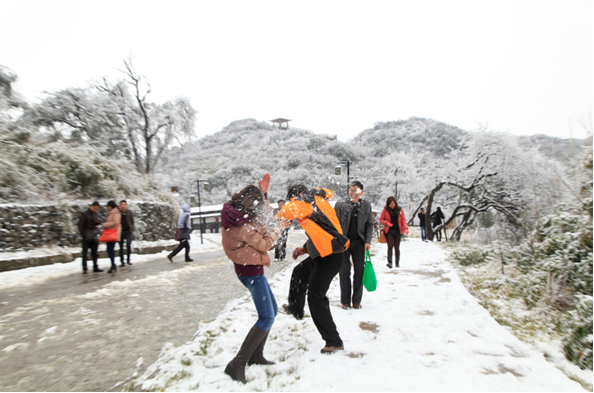25日晚,金佛山温度开始骤降,到26日凌晨两点左右,雪花开始纷纷扬扬的飘落下来,很快山上就变身成为了白雪皑皑的南国雪原。到上午十点左右,景区里已有了厚厚的积雪,小木屋、步道、树木皆铺上白雪厚毯,被冰晶包裹着,仿佛进入了童话般的世界。蜂拥而至的游客在雪地里打雪仗、堆雪人,玩的不亦乐乎。