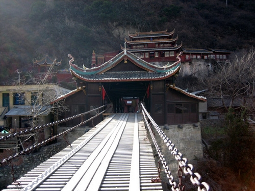泸定桥:坐落在泸定县城大渡河上,泸定桥桥台为固定地龙桩和卧龙桩的基础,桥亭属清式古建筑。为全国重点文物保护单位。该桥始建于清康熙44年,建成于康熙45年(1706年)。康熙御笔题写"泸定桥",并立御碑于桥头,桥长103米,宽3米,13根铁链固定在两岸桥台落井里,9根作底链,4根分两侧作扶手,共有12164个铁环相扣,全桥铁件重40余吨。1935年5月29日,中国工农红军长征途经这里飞夺泸定桥而使该桥闻名中外。