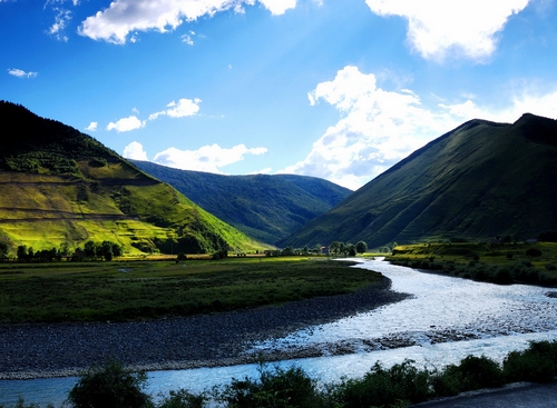 新都桥镇又叫东俄罗,海拔3300米左右,高原气候,温差较大,气候多变,初次上高原的朋友可能有不同程度的高原反应。他是川藏线南北分叉路口,北通甘孜、南接理塘,是从西藏通往康定的必经之路。距离成都437公里,距离康定城80公里,途中要翻越海拔4301多米的折多山,可远眺蜀山之王——贡嘎山。沿着川藏公路南线前行,只见一个个典型的藏族村落依山傍水地散布在公路两旁,一条浅浅的小河与公路相依相偎地蜿蜒流淌。房前路旁矗立着一棵棵挺拔的白杨,在秋风秋阳中炫耀着特有的金黄。 一群群的牦牛和山羊,点缀在新都桥田园牧歌式的图画中,平添出许多生动。远处的山脊,舒缓地在天幕上划出一道道优美的弧线。满眼蓝色、白色、金黄、黑色、绿色的饱和色块,在明丽的秋阳光线的描绘中,凸现着流畅的色彩和线条,使我们恍如置身画中。