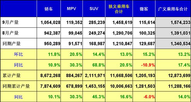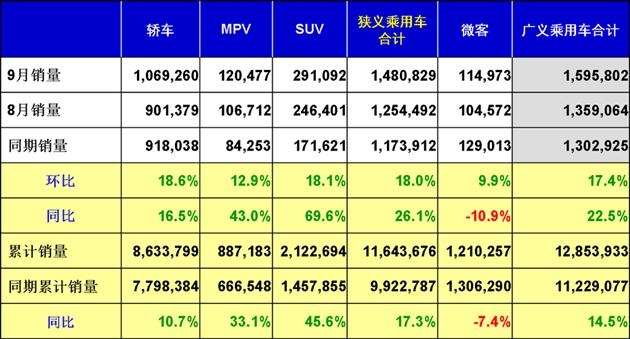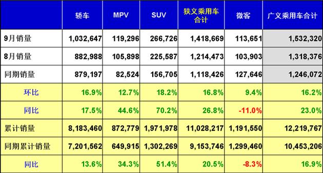 乘联会发布了9月份乘用车市场产销分析,9月份广义乘用车批发销量159.6万辆,同比上涨22.5%,环比上月销量上涨17.4%。其中,乘用车国内销量153.2万辆,同比增长23%,环比增长16.2%。其中,狭义乘用车实现批发销量达148.1万辆,同比增长26.1%,环比增长18.1%,。乘联会认为,每到金9车市自然会好,从月初到月底市场销量同比和环比均是大幅上涨。由于9月底节能车补贴暂停,抬高了9月份的销量。由于9月市场太火,本月出现了销大于产的情况,厂家库存大幅减少,但在季度末,经销商的库存也增加,不过比预想的小一些。