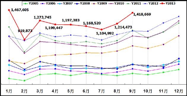 2005—2012年乘用车(轿车/MPV/SUV)月销量走势图如下图
