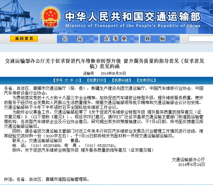 6月30日,交通部在其官网上发布了《关于征求促进汽车维修业转型升级提升服务质量的指导意见(征求意见稿)》(以下简称“意见稿”),并公开向社会征求意见。