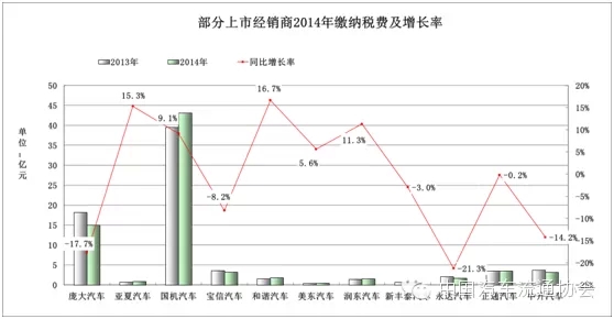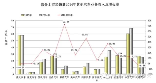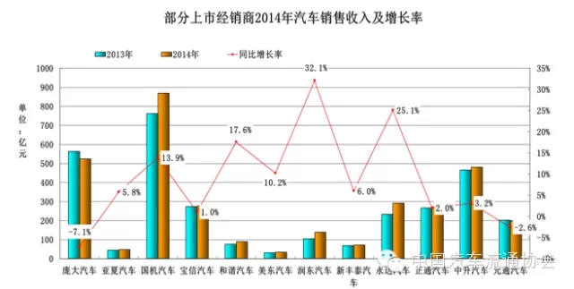 图4 部分上市经销商2014年汽车销售收入及增长率