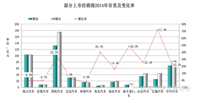 2014年度大部分企业期末库存较期初有所增加,最高增幅达71.9%,上市集团期末库存整体较期初增加了20.91%。库存绝对量的增加,一部分是由于企业营业规模扩大、营业网点扩张带来的合理库存增加,另一部分则是由于当前汽车市场存在产能过度释放与需求相对不足的矛盾,同时受到我国汽车产销体制的影响,使汽车经销商背负了大部分过剩产能。