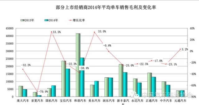 图11 部分上市经销商2014年平均单车销售毛利及增长率