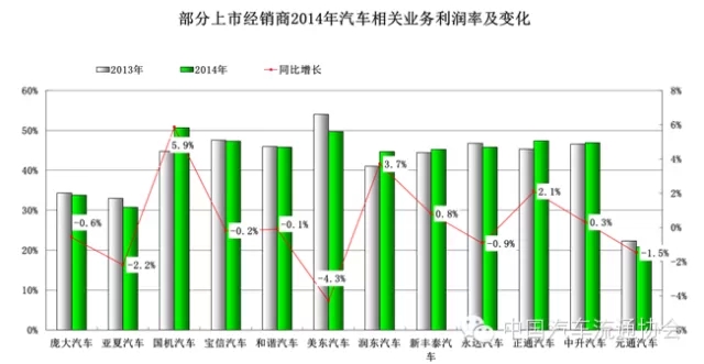 图13 部分上市经销商2014年汽车相关业务利润率及变化