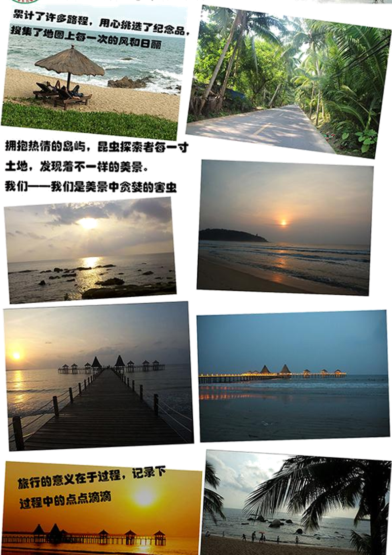 海南的旅游资源十分丰富,极富特色,海岸带景观:在海南长达1528公里的海岸线上,沙岸约占50~60%,沙滩宽数百米至数千米不等,向海面坡度一般为5度,缓缓延伸;多数地方风平浪静,海水清澈,沙白如絮,清洁柔软;岸边绿树成荫,空气清新;海水温度一般为 18~30℃,阳光充足明媚,一年中多数时间可进行海浴、日光浴、沙浴和风浴。当今国际旅游者喜爱的阳光、海水、沙滩、绿色、空气这5个要素,海南环岛沿岸均兼而有之。昆虫俱乐部带您海南春节自驾游!